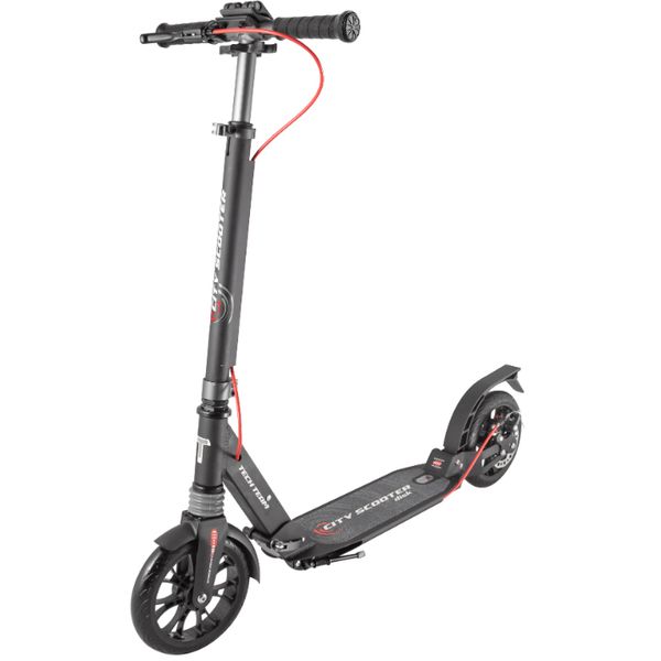 Скутер оснащен передним и задним амортизаторами, что в совокупности с 200 мм колесами шириной 30 мм и специальным полиуретановым покрытием сглаживает неровности дороги. Для улучшения эстетической составляющей на боковины полиуретанового покрытия нанесен рельеф. В колесах используются подшипники стандарта ABEC 9. Особенность модели - ручной дисковый тормоз, позволяющий не только выполнять эффективное торможение, но и по настоящему украшающий самокат. Тросик тормоза, в отличие от многих аналогов, проведен через специальные каналы в рулевой стойке и деке и не мешает езде. Кроме дискового тормоза в самокате применен привычный ножной тормоз -крыло на заднем колесе, который дополнительно оснащен брызговиком с красным светоотражающим элементом. Система складывания выполнена по схеме PushFold. Это проверенная временем надежная система полностью исключает люфт в месте складывания.