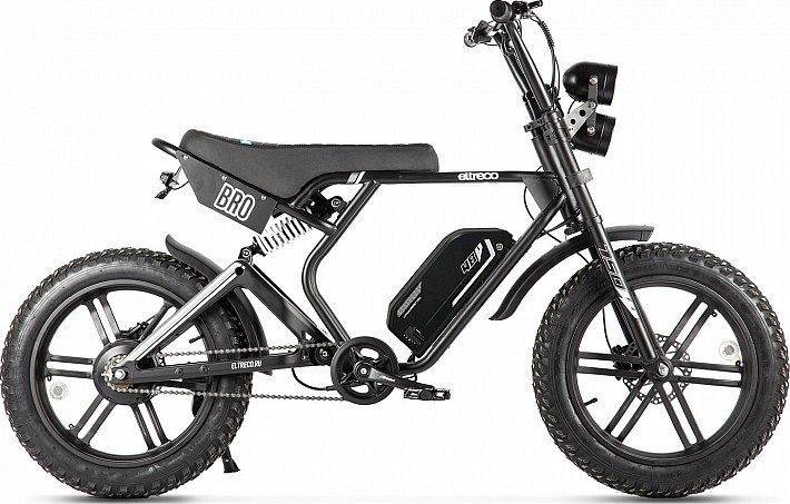 Отличная проходимость Eltreco BRO 500 обеспечивается благодаря большим колёсам 20х4.0" с широкими ободами, а также качественным покрышкам с глубоким протектором и увеличенным пятном контакта. С прохождением бездорожья помогут справиться передняя амортизационная вилка и задний амортизатор. Максимальная грузоподъемность модели составляет 110 кг.