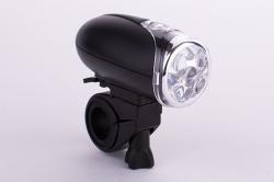 Фонарь велосипедный передний. Белый свет; питание 3 х ААА; 5 диодов; 2 режима работы: постоянный + мигающий режим. Быстросъемный крепеж на руль.