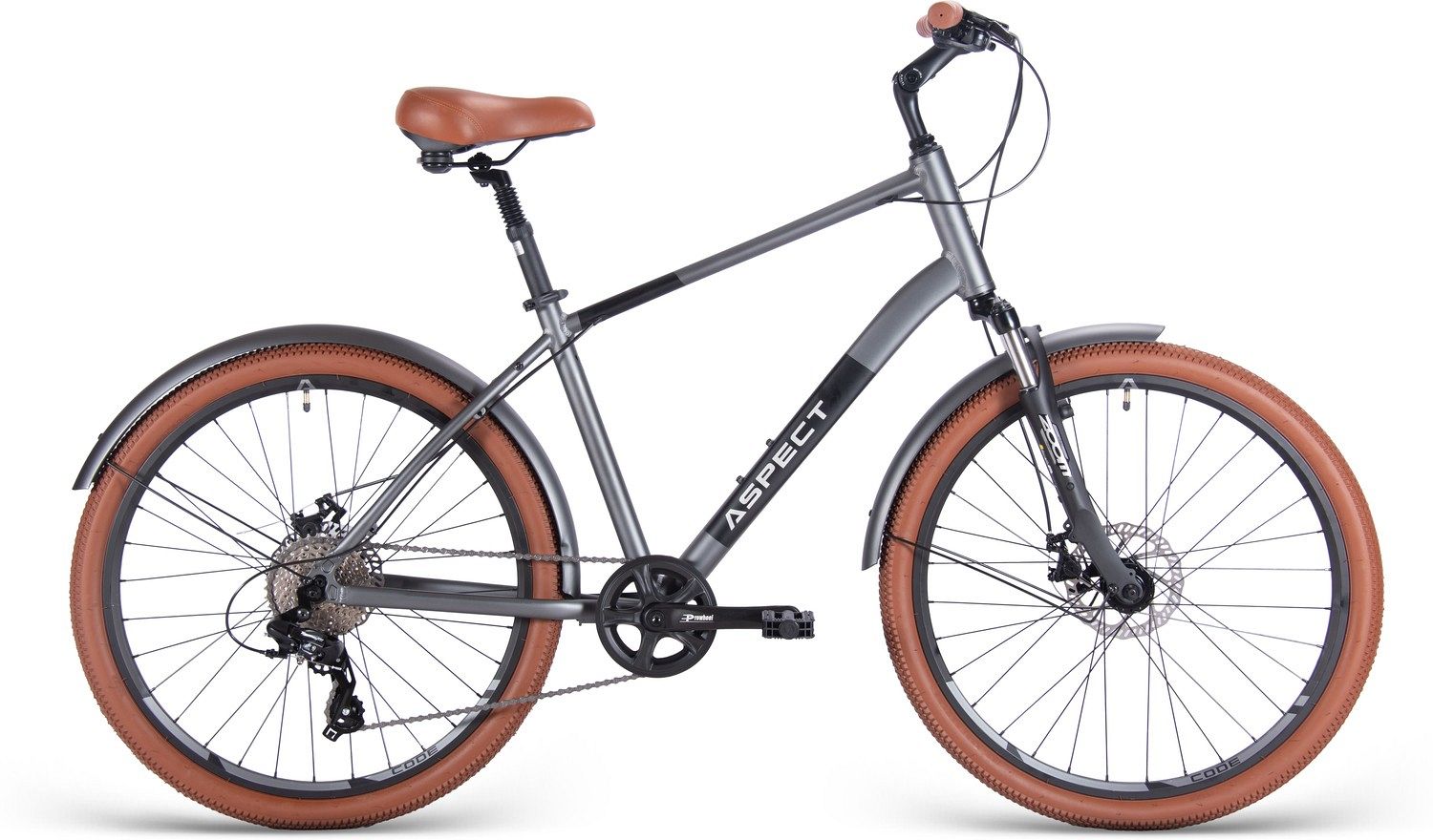 Aspect Weekend оснащён лёгкой и прочной алюминиевой рамой ALU 6061 с гидроформированными трубами и внутренней прокладкой кабелей. Комфортная геометрия рамы обеспечивает удобную посадку, снижая нагрузку на спину и плечи. Пружинно-эластомерная вилка Zoom 141D с ходом 45 мм сглаживает неровности дороги, делая каждую поездку максимально комфортной.