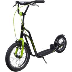 Внедорожный самокат Novatrack Stamp N1 - сделанный как для взрослых, так и для детей от 10 лет. Модель сочетает в себе все достоинства самоката и велосипеда. Большие надувные колеса без особого труда преодолевают городские бордюры и грунтовые ухабы. В комплект уже входят крылья, которые защитят Вас от грязи и мелких камней. Надувные колеса имеют ряд ощутимых преимуществ. Они бесшумны, с мягкими колёсами поездка будет мягче и комфортнее. Хорошо защищают от неровностей благодаря амортизирующим свойствам. Такие колёса комфортны при езде по неровным дорогам. В дождливую погоду надувные колеса увереннее держатся в поворотах. Они отлично тормозят и не скользят на разных поверхностях. Благодаря отличному сцеплению, помогают развивать более высокую скорость.