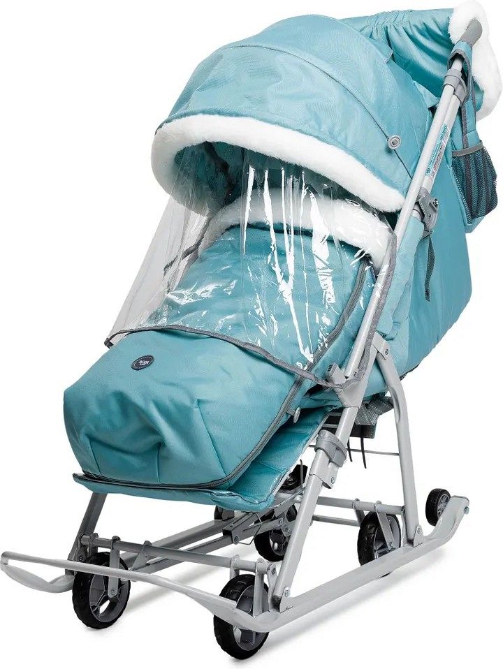 Модель оснащена складным трёхсекционным козырьком и тентом-дождевиком, так что снег, ветер и даже моросящий дождь не станут помехой для прогулки. Тёплый чехол на ножки с круговой молнией позволяет легко усадить ребёнка внутрь, не создавая лишних неудобств. В комплекте также есть меховой матрасик, который добавит уюта, а удобная сумка и меховая муфта помогут взрослым держать руки в тепле.