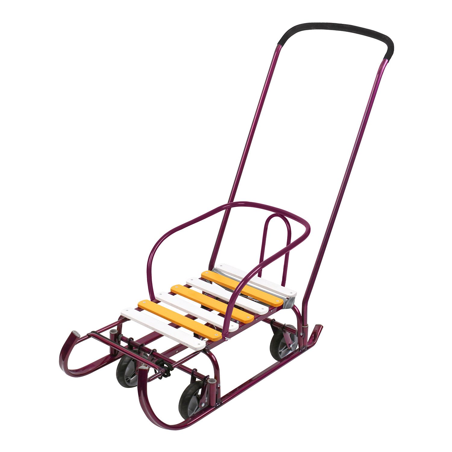 Металлические санки с механизмом выдвижных колесных шасси с родительской ручкой-толкателем для катания и перевозки детей.