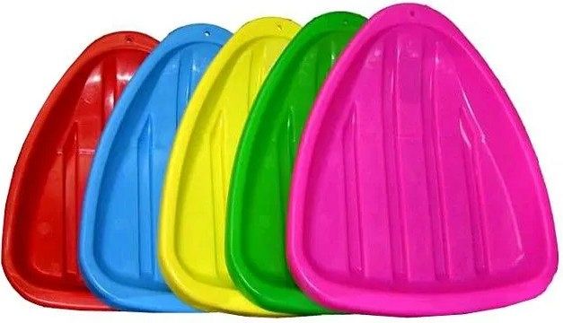 Ледянка треугольной формы с бортиками по периметру. Спереди имеются отверстия для шнура. Изделие имеет направляющие полозья.