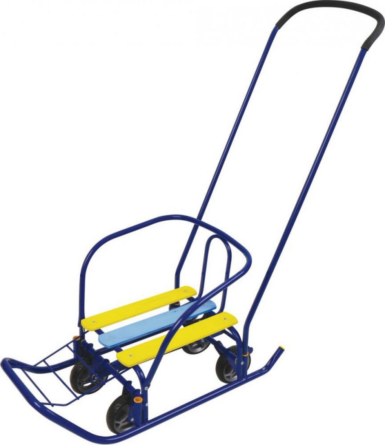 Удобные санки с продольной рейкой и укороченной базой. Ступенчатая подножка. Полозья и колёса для лёгкой транспортировки и передвижения по любой дороге. Надёжная фиксация ручки обеспечивается пластиковым вкладышем на толкателе. Санки с выдвижной колесной базой и ручкой-толкателем для катания и перевозки детей.