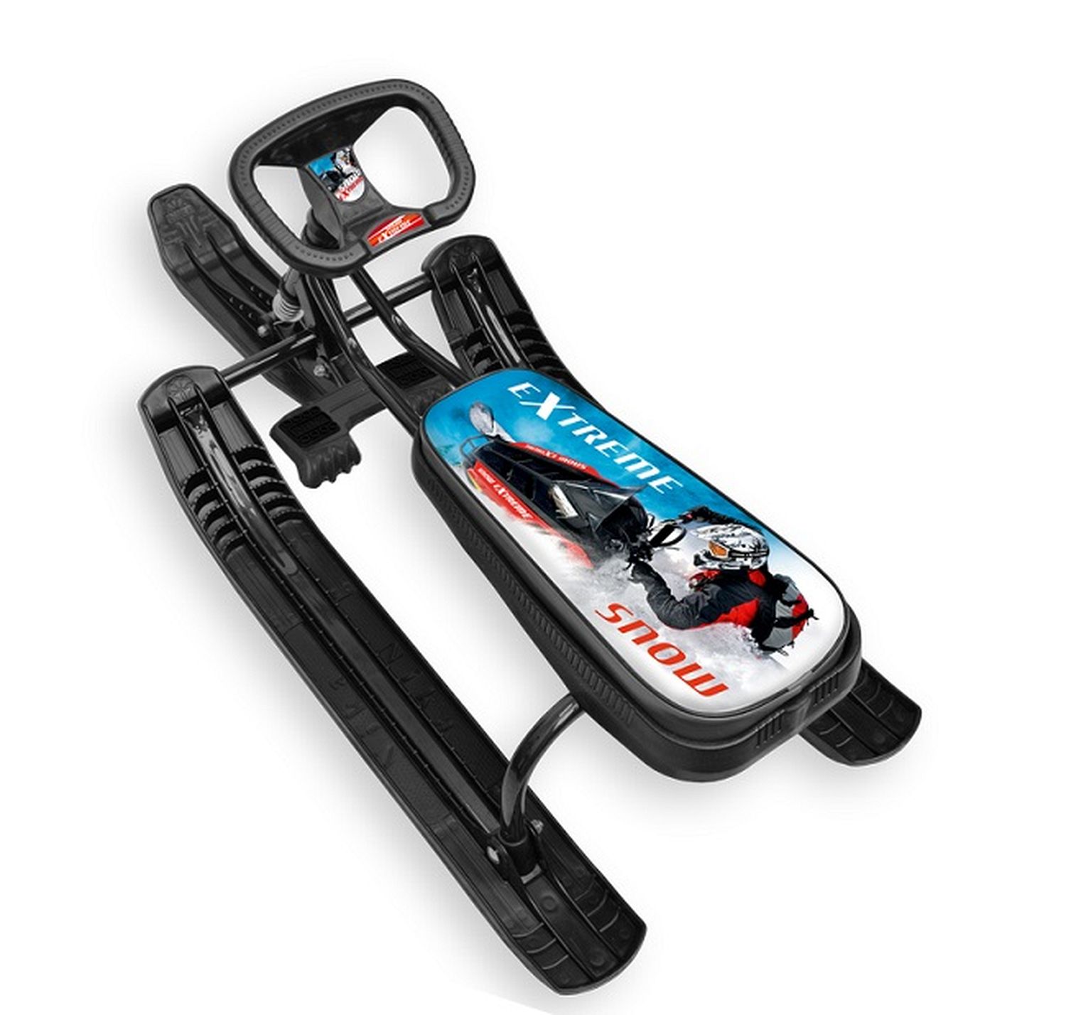 Классический снегокат с усиленным тормозом оценят и дети, и взрослые. Это и отличный способ семейного отдыха. Яркая маневренная модель придется по душе любому ребенку. Она имеет прочный металлический каркас, удобное сиденье и классическое расположение полозьев. Ребенок может управлять движением снегоката при помощи руля, который направляет ведущую переднюю лыжу. Также имеется прочная веревка с удобной пластиковой ручкой, при помощи которой снегокат легко перемещать. Снегокат имеет мягкое сиденье с принтом.