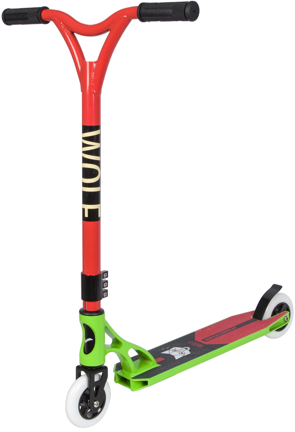 Novatrack Wolf - трюковой самокат предназначенный для агрессивной езды и способен выдержать самые большие нагрузки. Моноблочный вынос, алюминиевые колеса, рулевая с пром. подшипниками и облегченная вилка, так же выполненная из алюминиевого сплава, все это делает самокат Novtrack Wolf не только максимально легким, но и достаточно прочным.